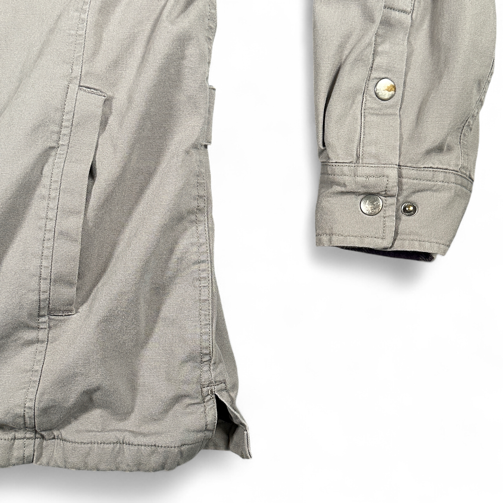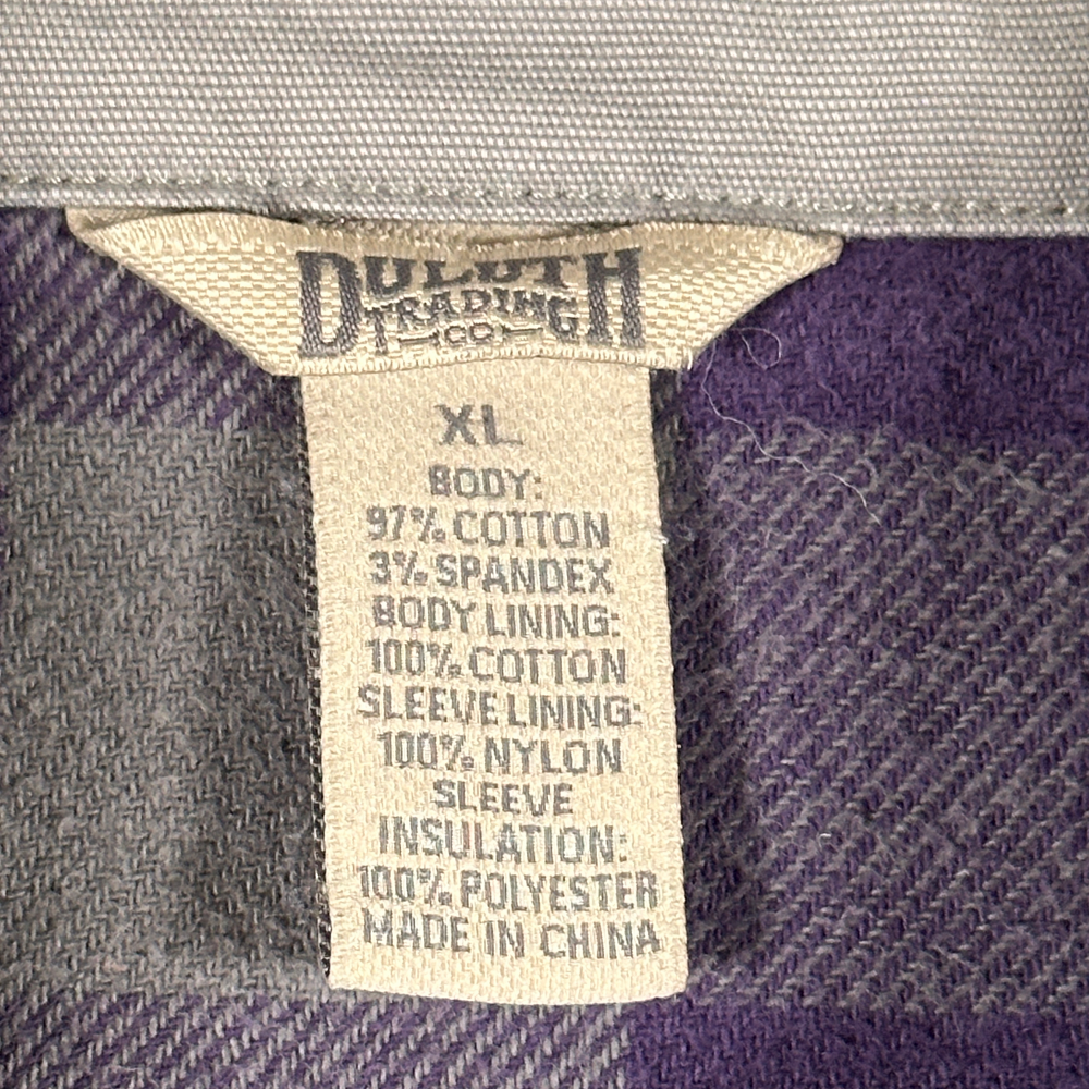โข Gray cotton spandex blend shell with a purple and gray plaid cotton body lining, nylon sleeve lining, and polyester insulation shirt jacket