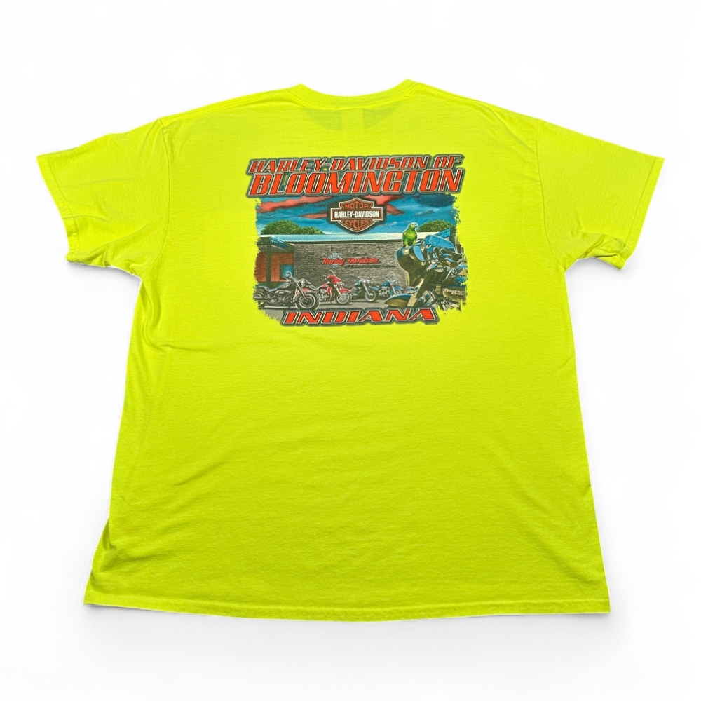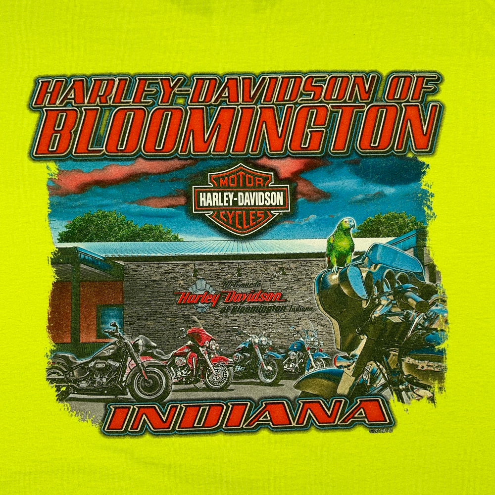โข Graphic on back says “HARLEY DAVIDSON OF BLOOMINGTON” and “INDIANA”