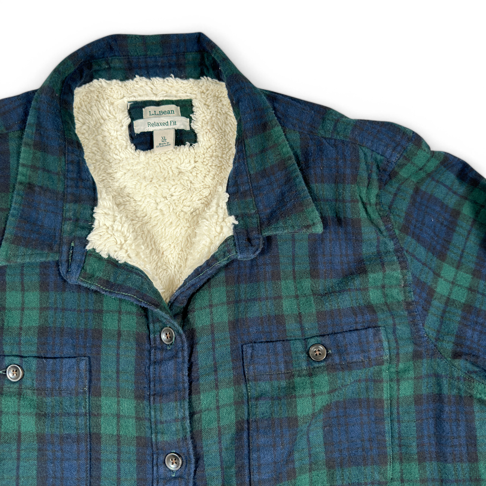 LL Bean Shirt Women EXTRA LARGE Blue Green Plaid Sherpa Lined Flannel Blackwatch