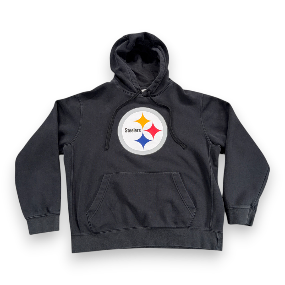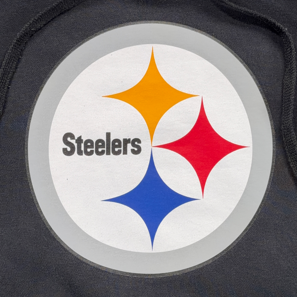 – Front graphic features Steelers logo with yellow, red, and blue stars on white and gray circle background with “Steelers” text