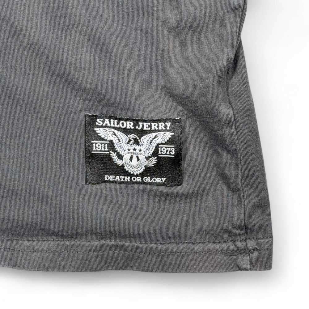 โข Woven brand patch on front hem “SAILOR JERRY 1911 1973 DEATH OR GLORY” with eagle graphic