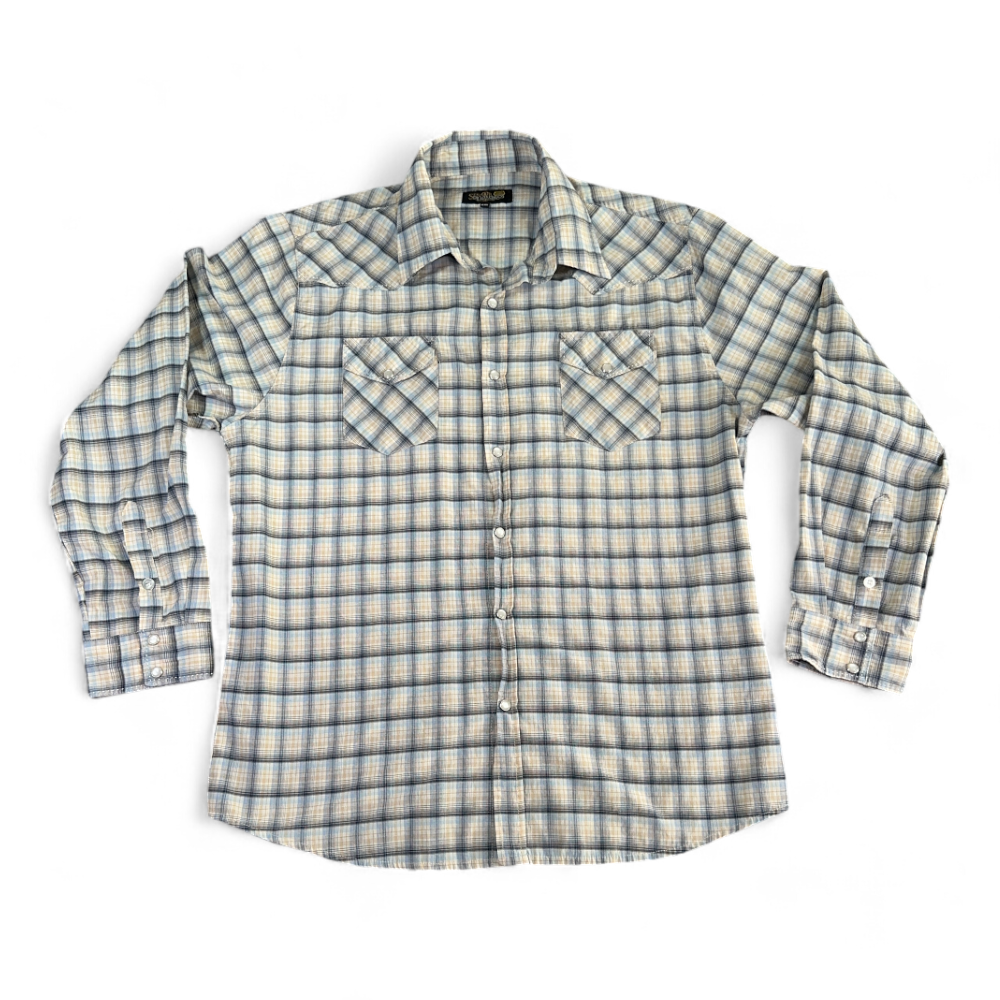 โ€ข Modern pearl snap western shirt.