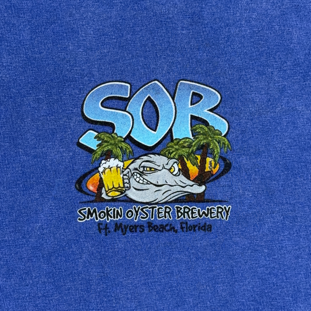 – Large back graphic of same oyster holding beer mug with palm trees & sunset, “SOB,” “Smokin Oyster Brewery,” & “Ft. Myers Beach, Florida”