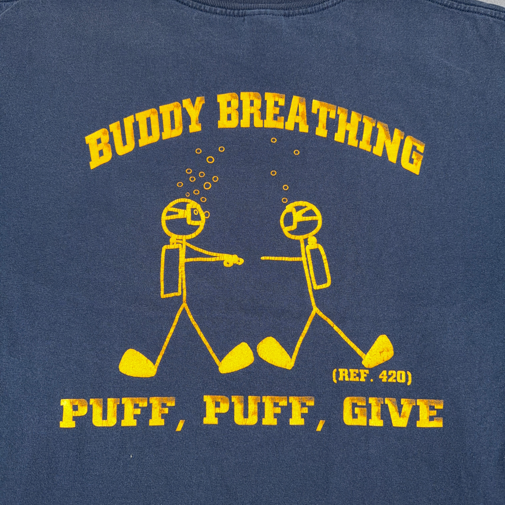 โข Large yellow graphic on back: “BUDDY BREATHING” with two stick-figure divers sharing a regulator