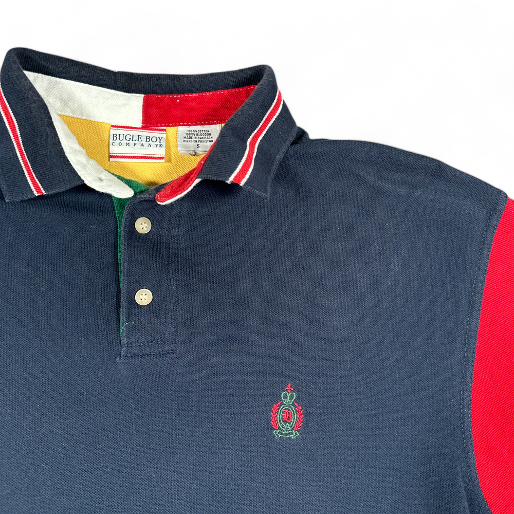 Vintage Bugle Boy Polo Shirt Blue Green Colorblock Crest 90s Adult SMALL