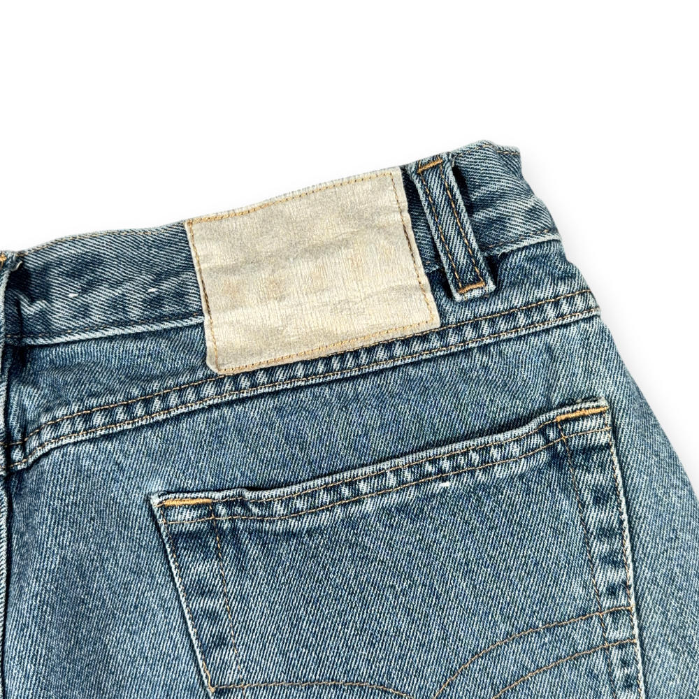 – Faded light wash with moderate overall patina & whiskering through seat & thighs