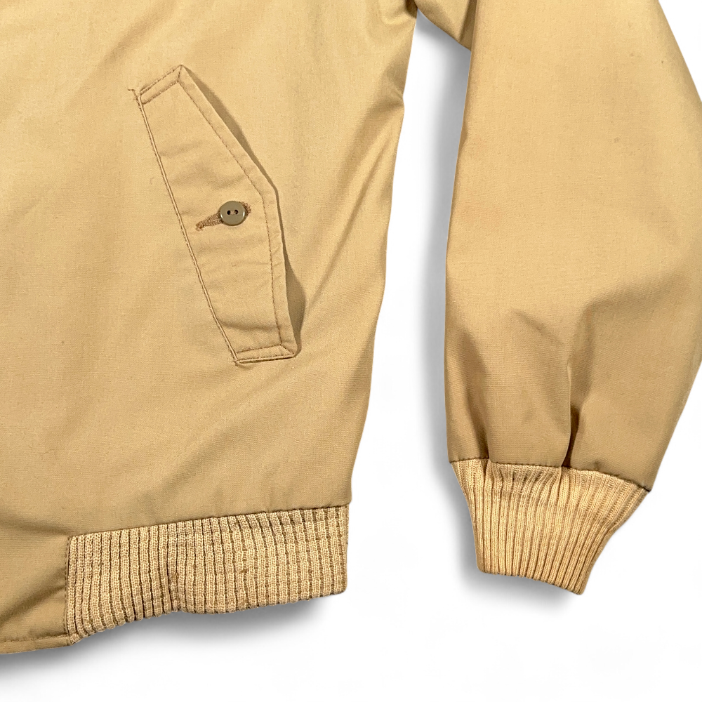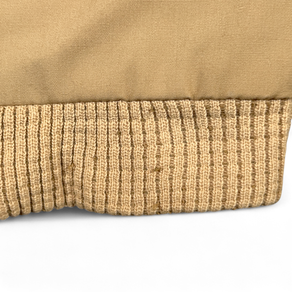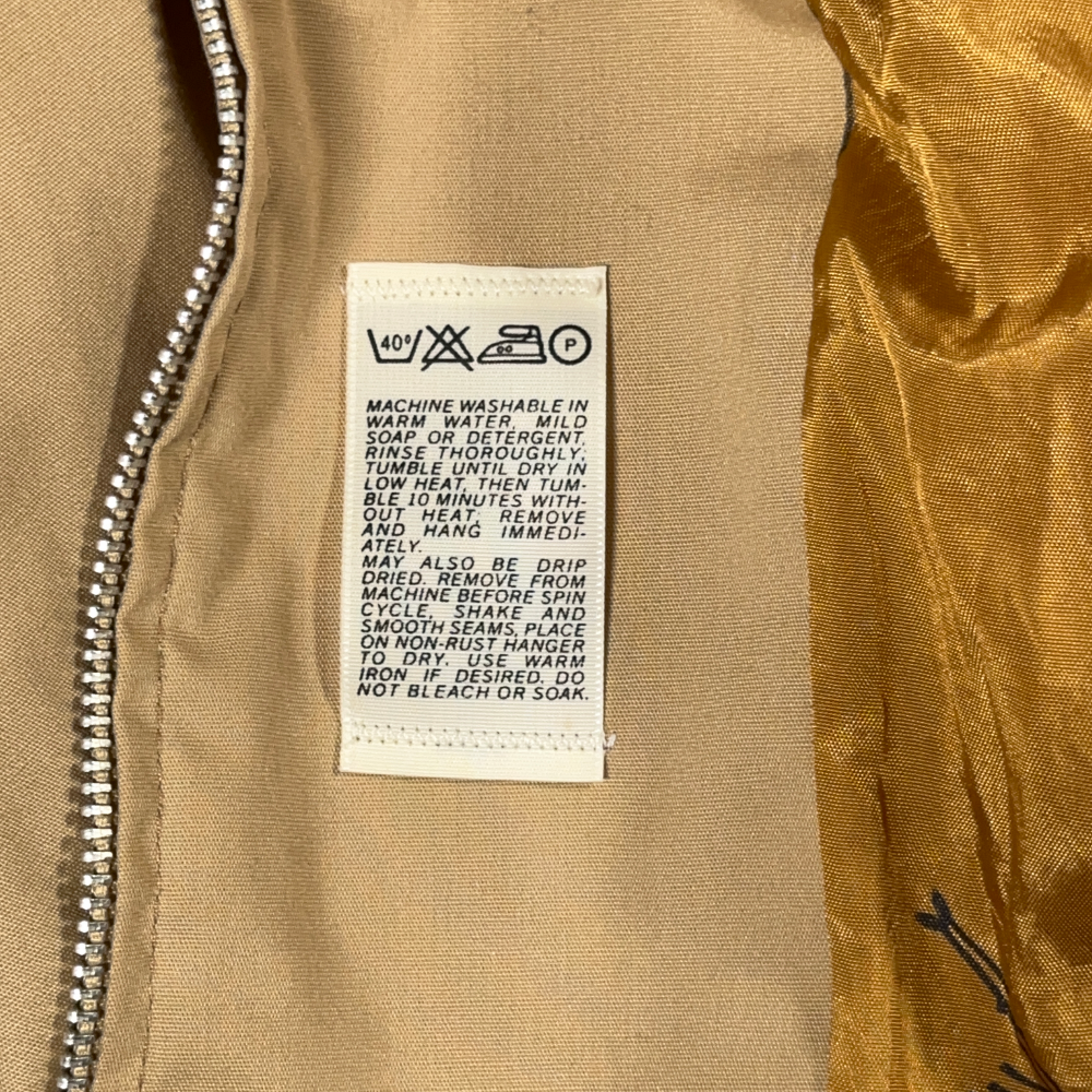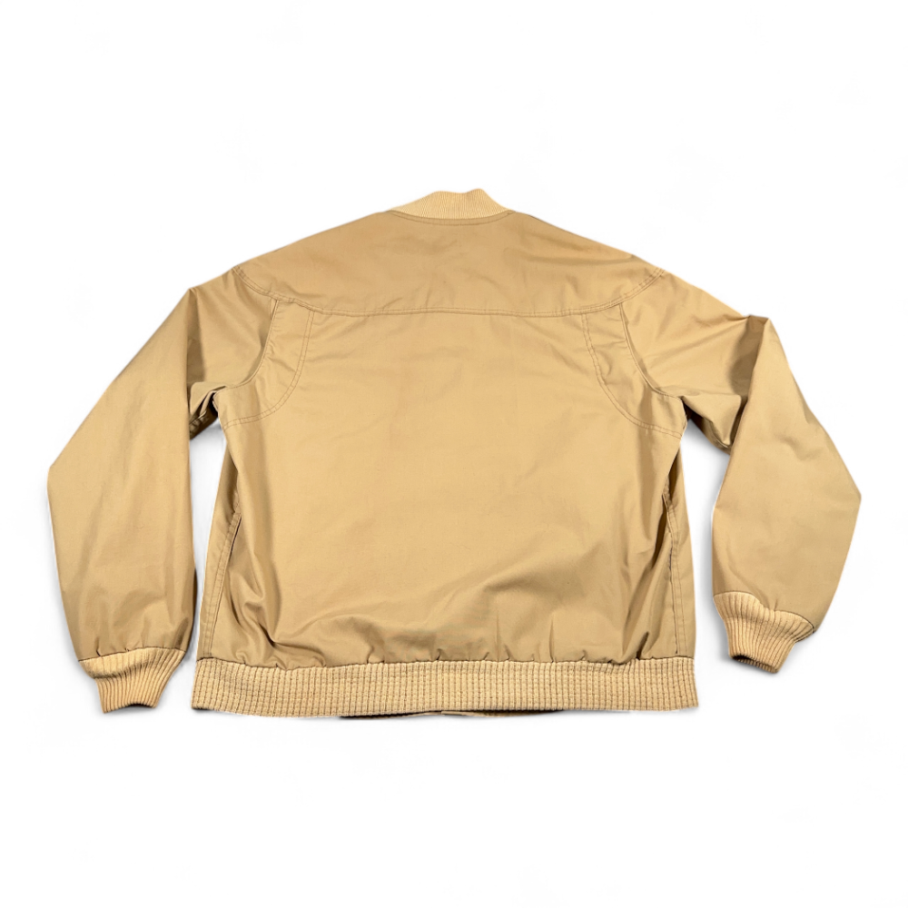 โข Tan jacket with a printed lining and knit trim – material tag missing, likely a polyester cotton blend