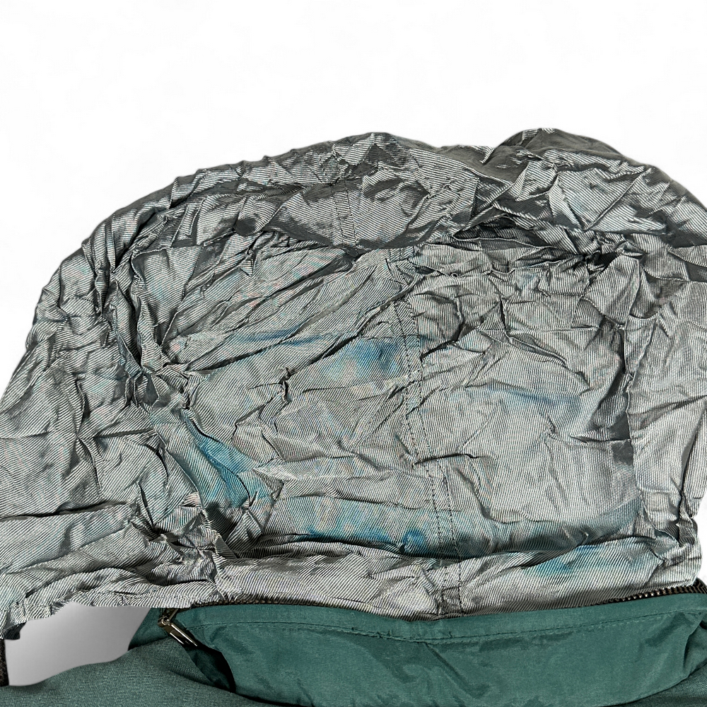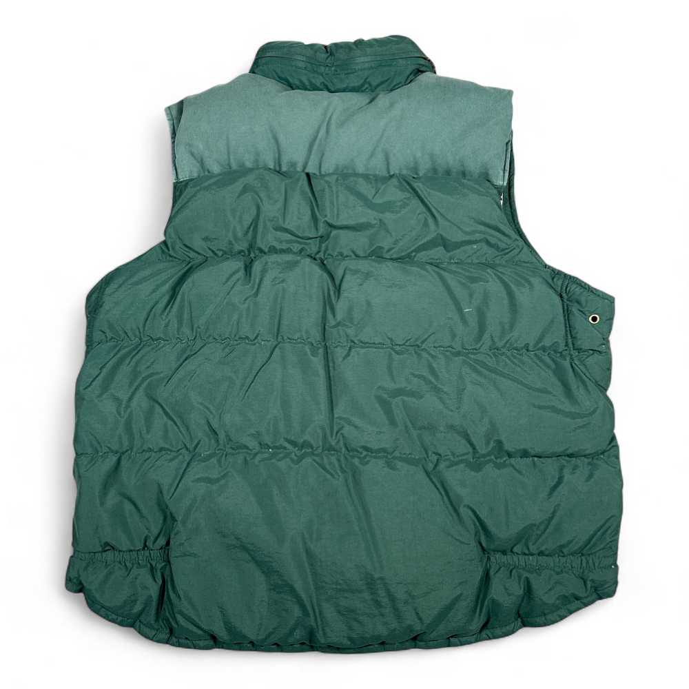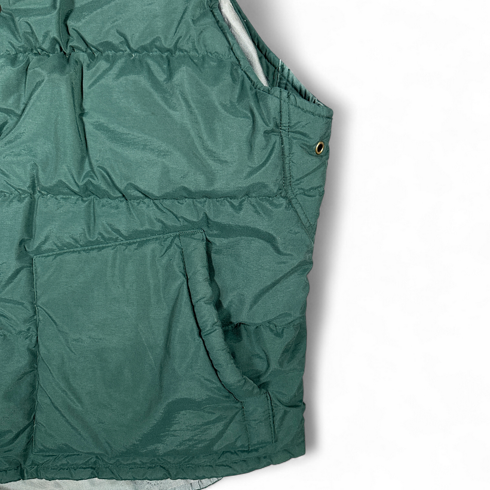 • 90s vintage green nylon shell; nylon, acetate blend lining; down, waterfowl feather fill vest