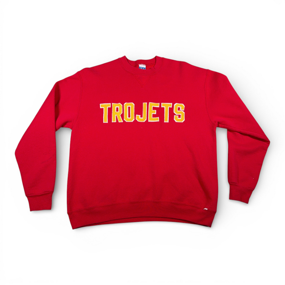 Vintage High School Sweater Adult MEDIUM Red Sweatshirt Trojets Russell USA 90s