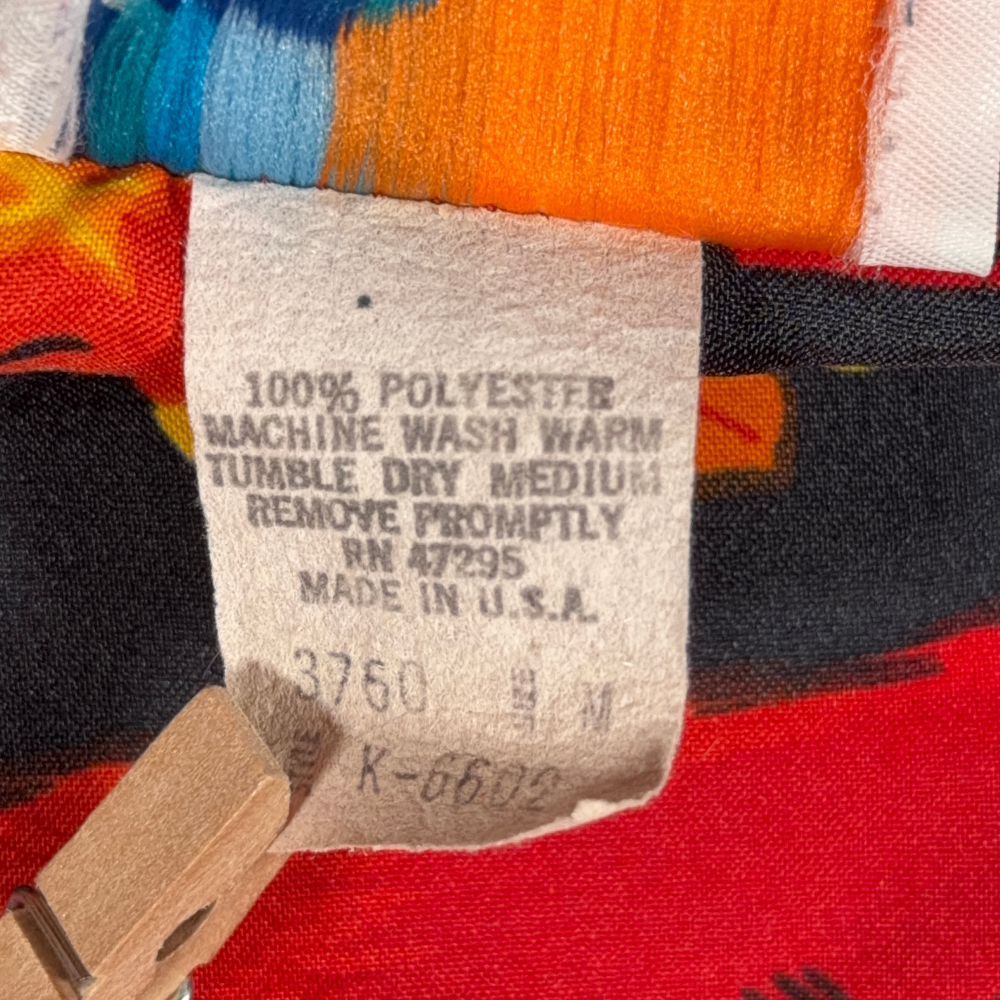 โ€ข Vintage 70s red, orange, yellow, and black polyester hawaiian shirt