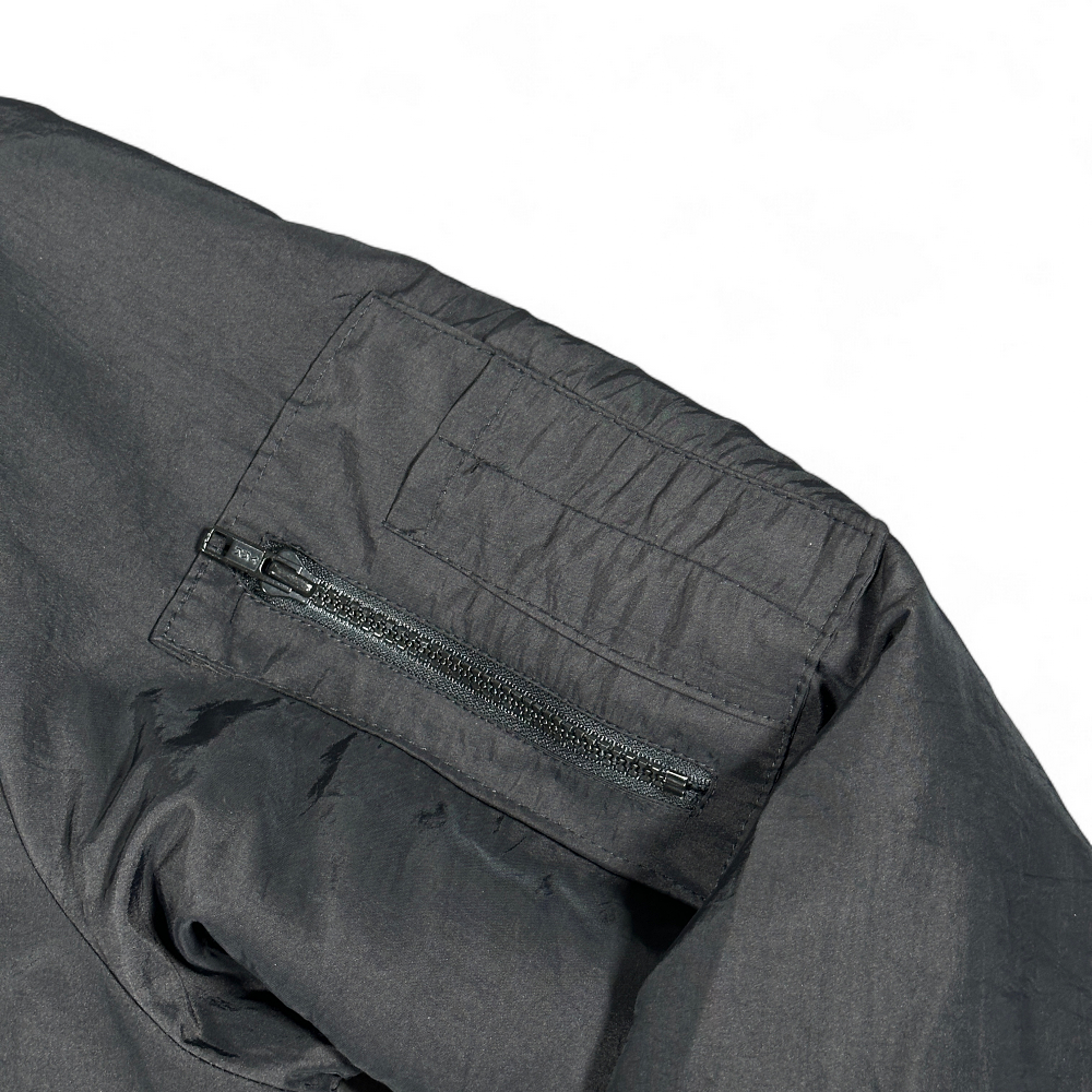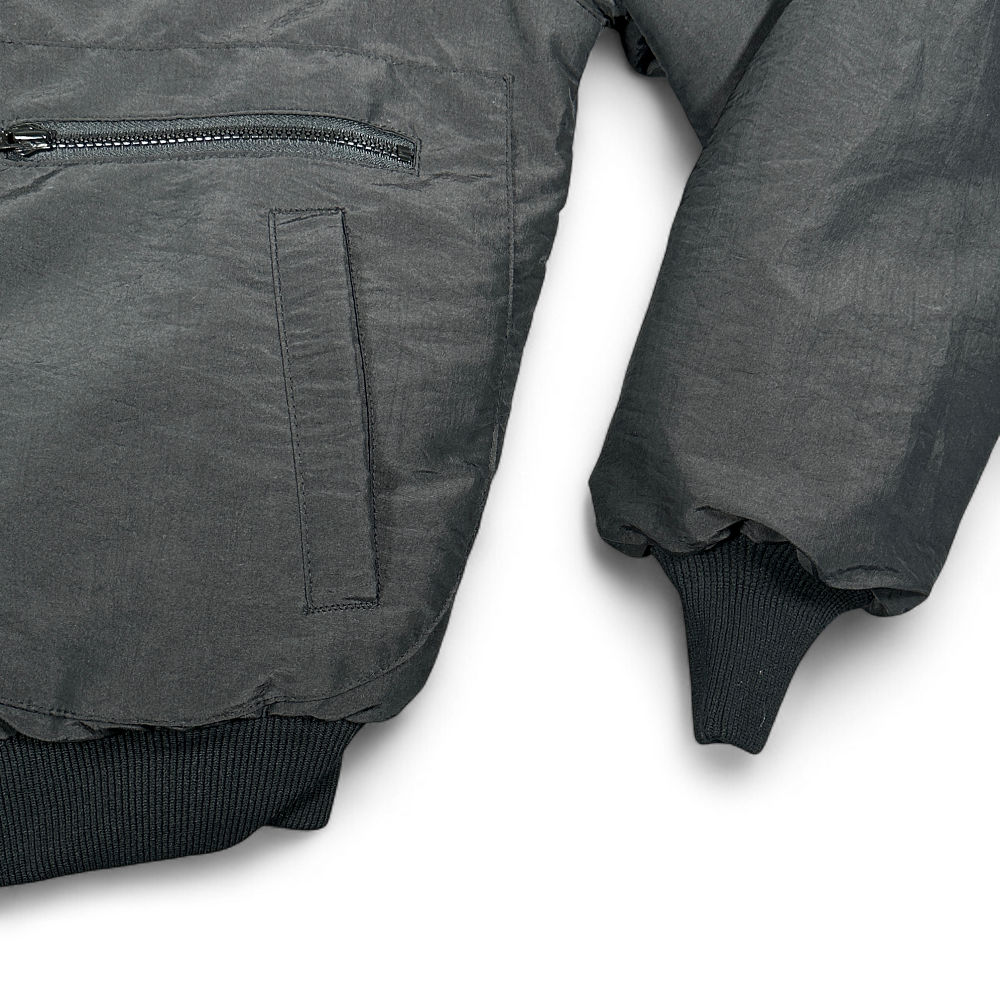 โ€ข 80s vintage black polyester, nylon blend shell; sherpa, acrylic lining; nylon trim bomber jacket