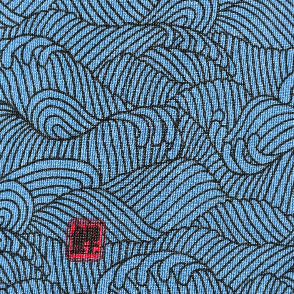 โ€ข All-over pattern featuring black ocean waves over light blue background
