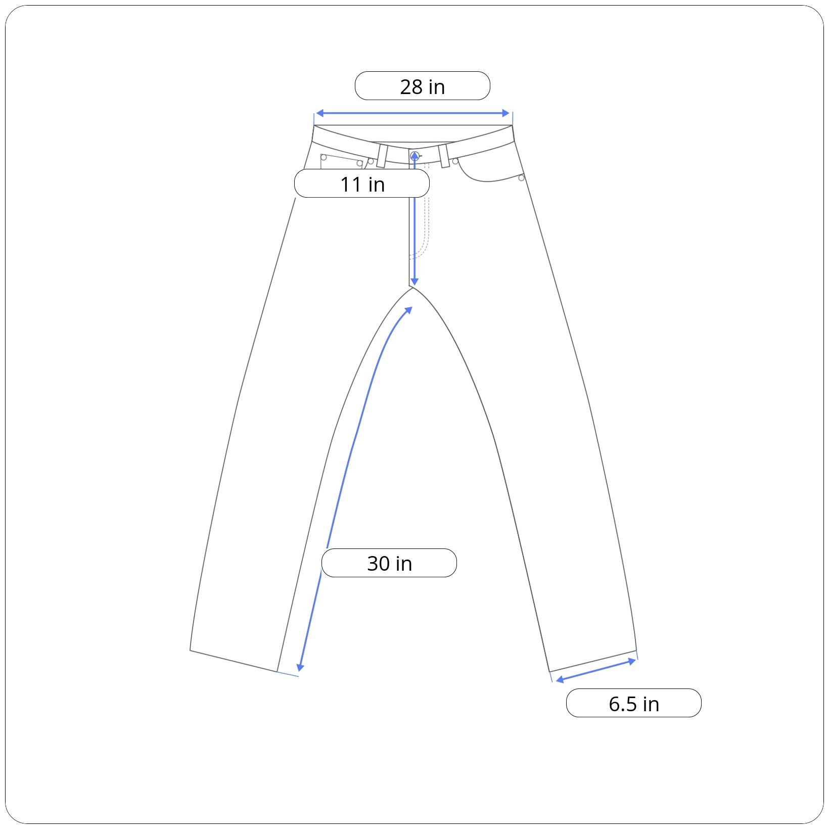 Rise: 11 inches (crotch to top of waistband)