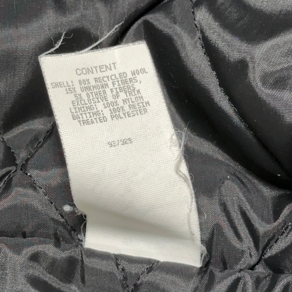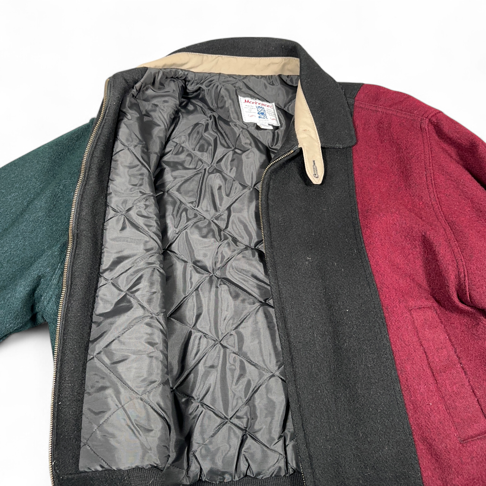 โข Black, green, and burgundy colorblock recycled wool blend shell with a quilted nylon lining