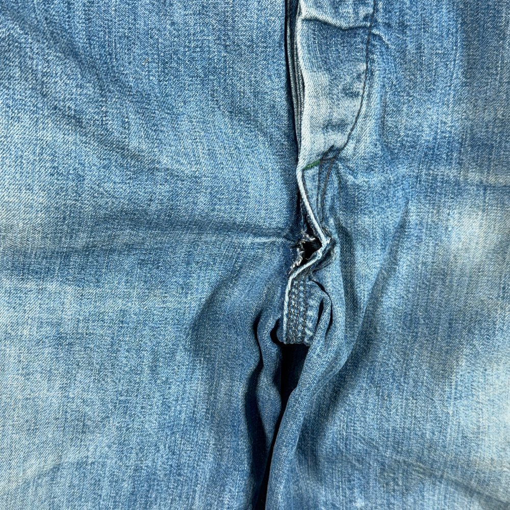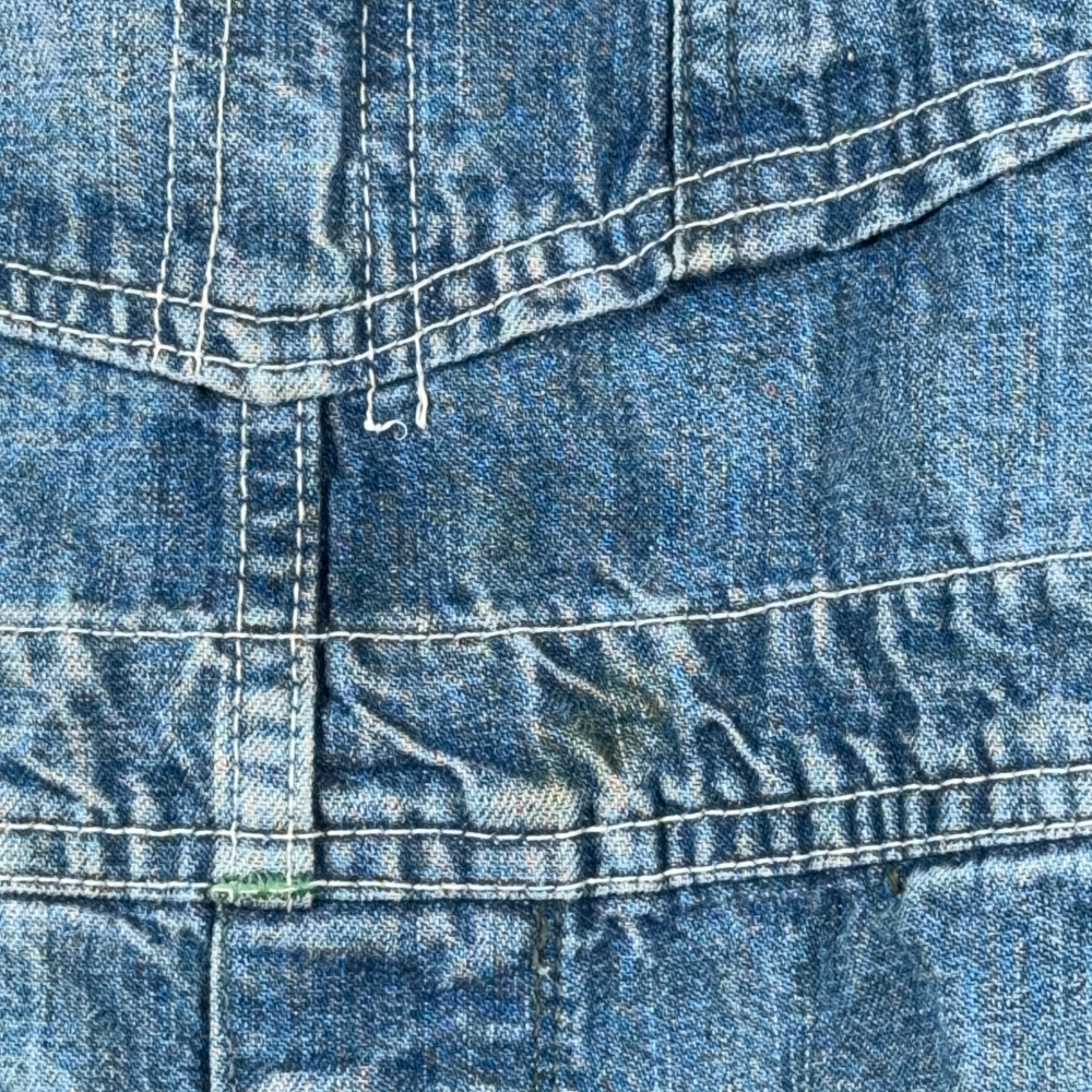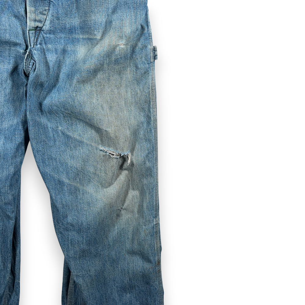 • Great condition. Patina, medium hole over the left thigh, and some workwear discoloration. Crotch seam has split partially. Overall general wear consistent with age and work use (please see pictures)