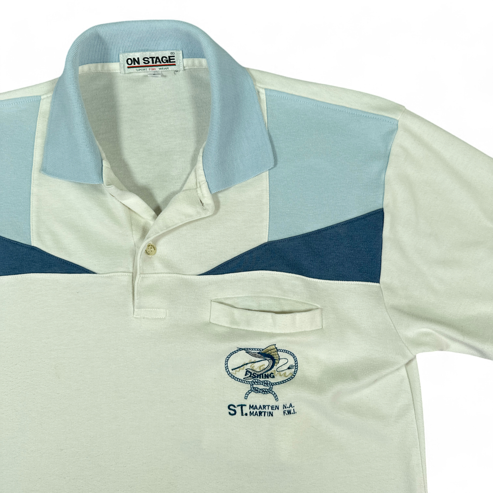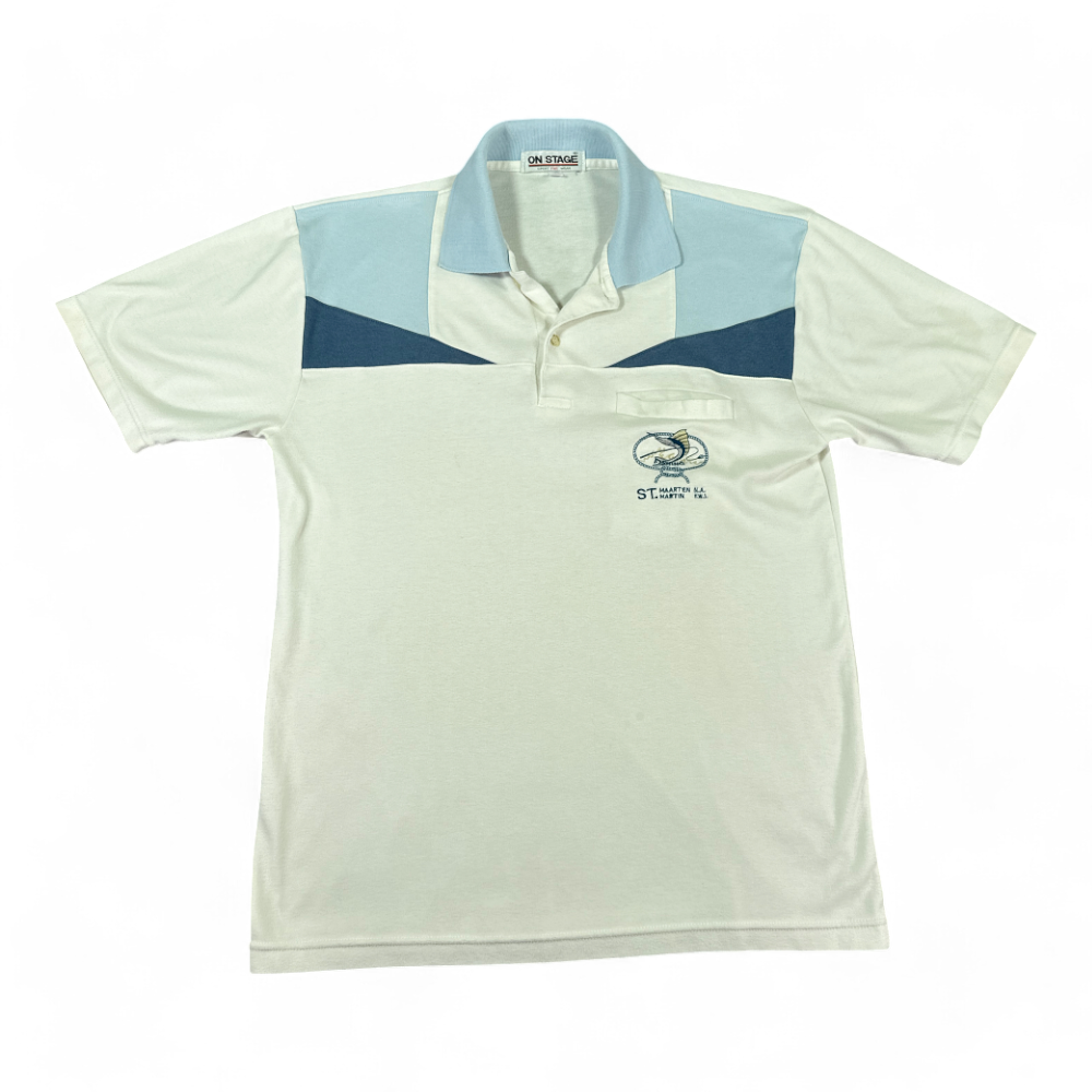 Vintage Polo Shirt White Blue St Maarten Fishing Color Block Inlay 90s Adult MEDIUM