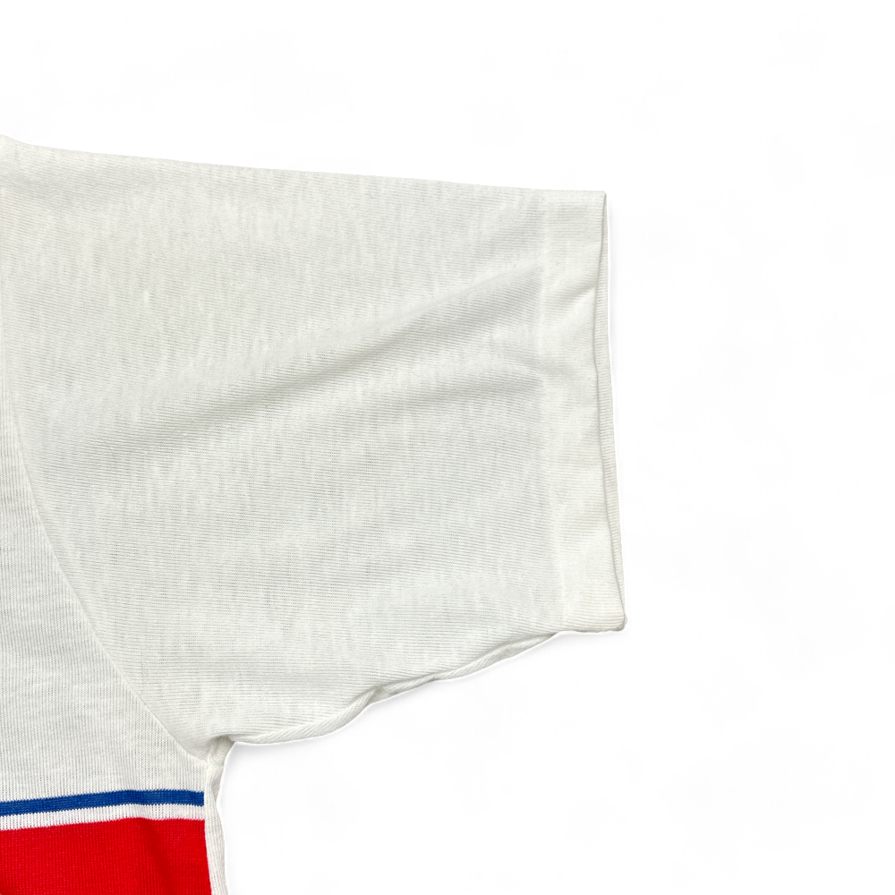 โข Classic red and blue cross-chest stripe pattern.