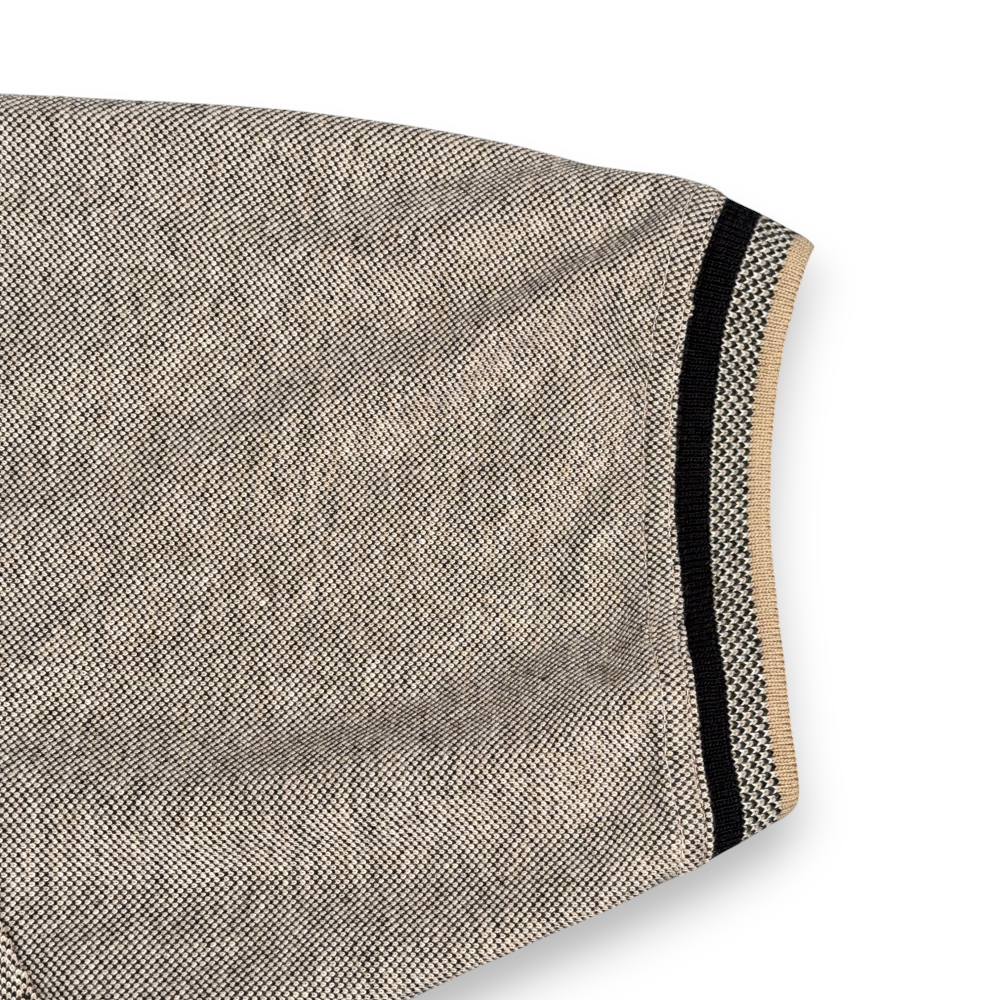 โข Short sleeves with ribbed cuffs featuring black and tan stripes
