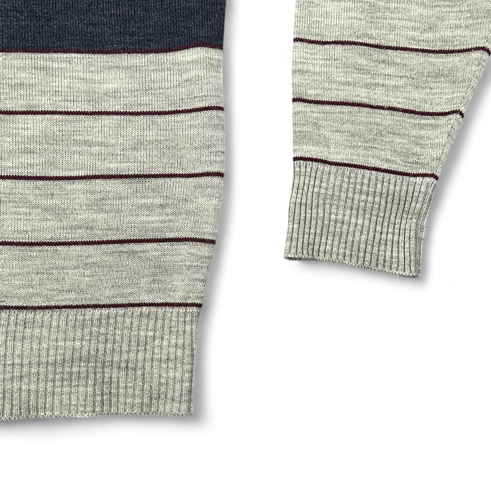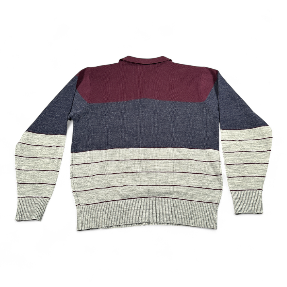 โข Burgundy, charcoal, and heather gray colorblock and striped 100% acrylic knit
