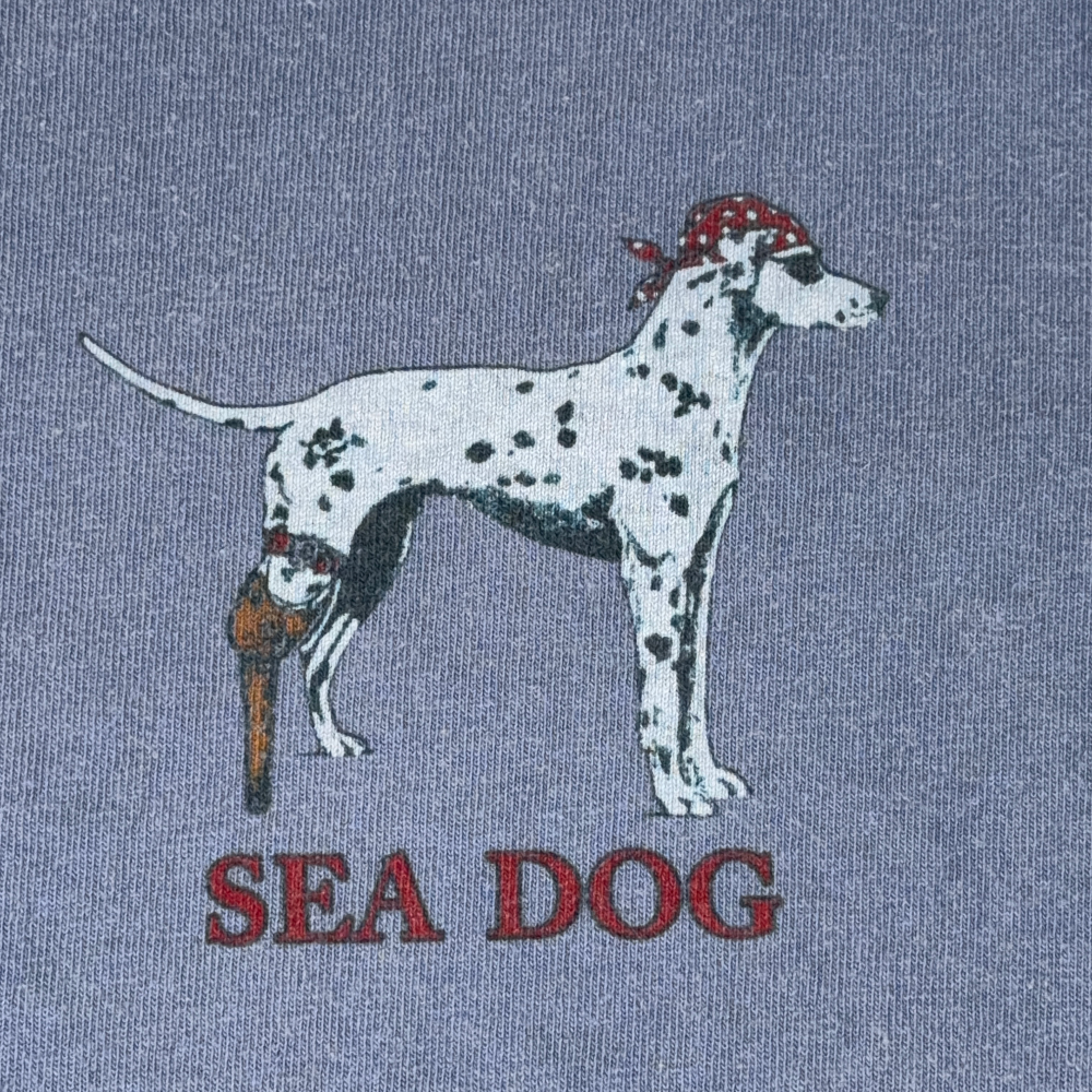 โข Small front graphic “SEA DOG” with Dalmatian wearing a bandana and pegleg