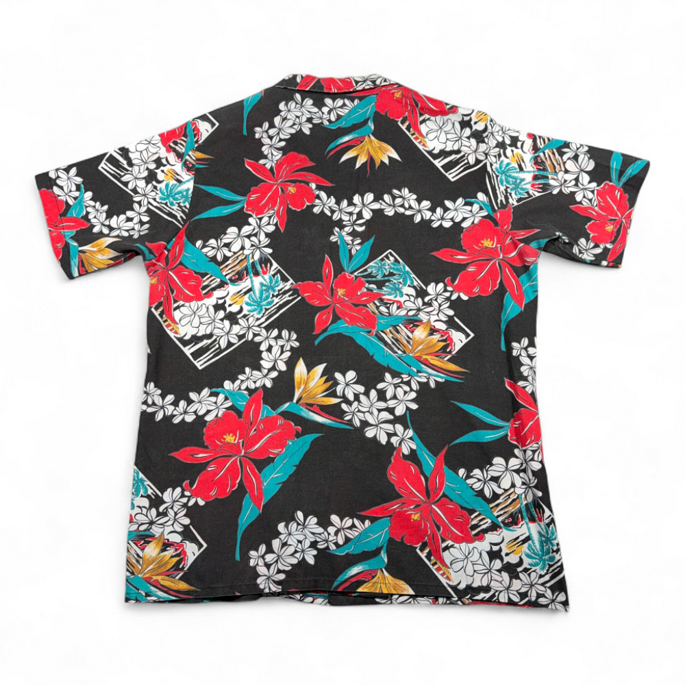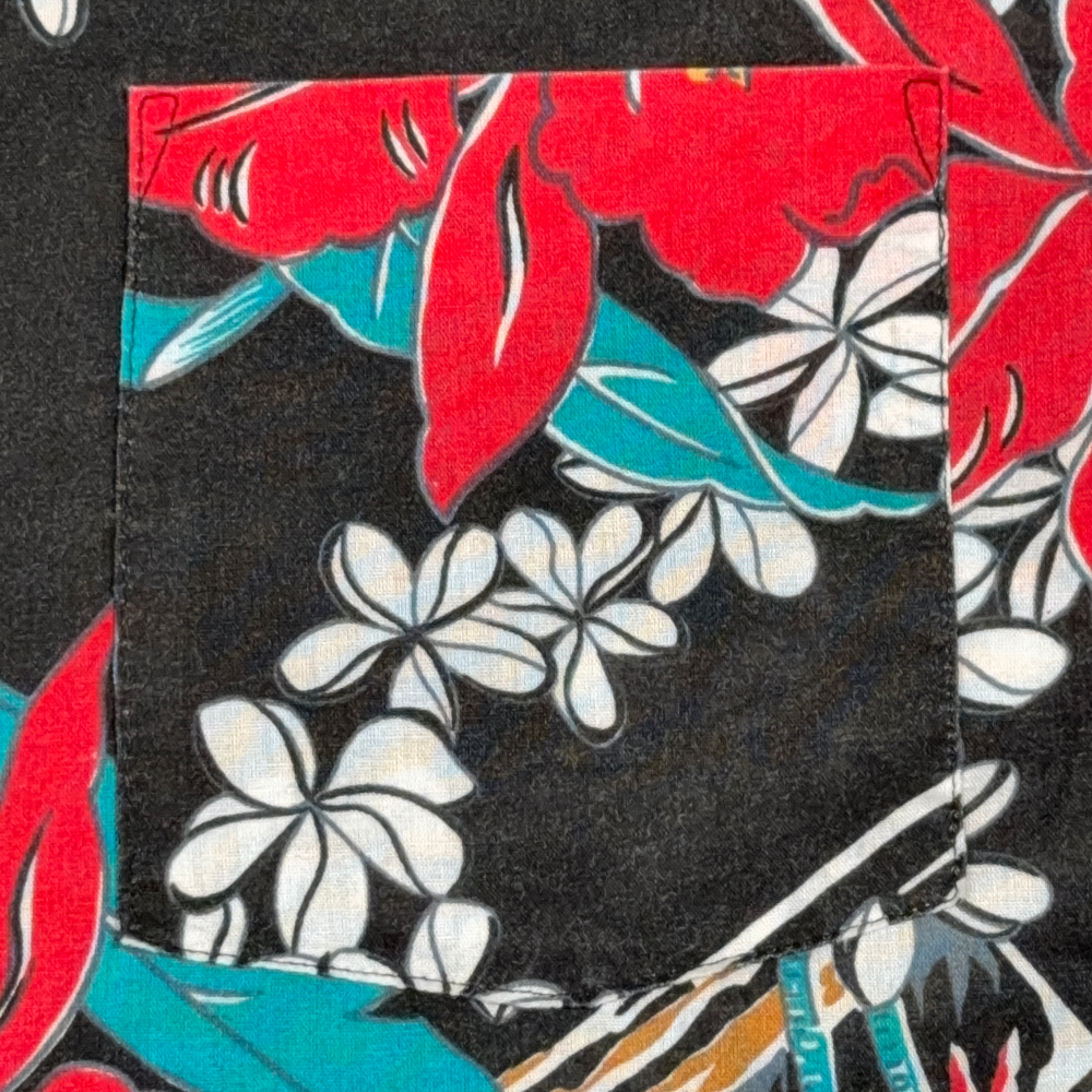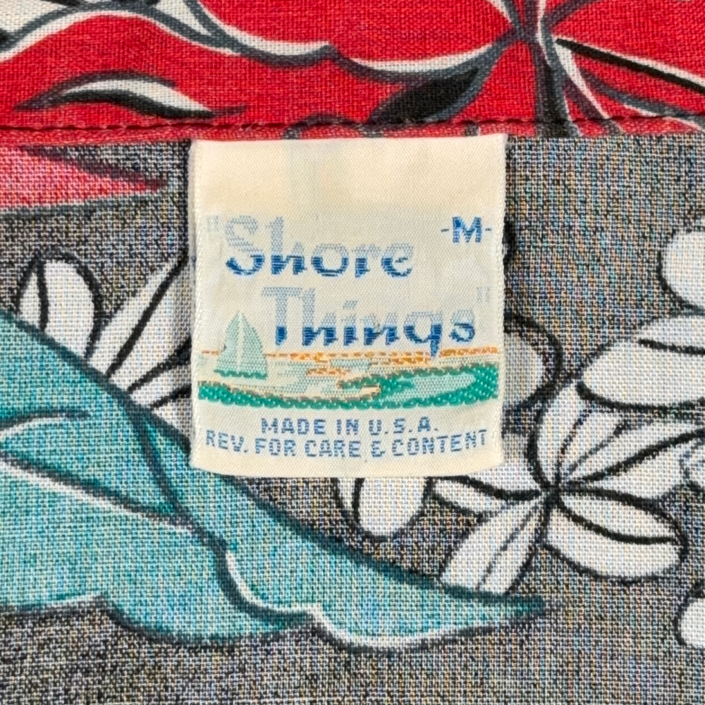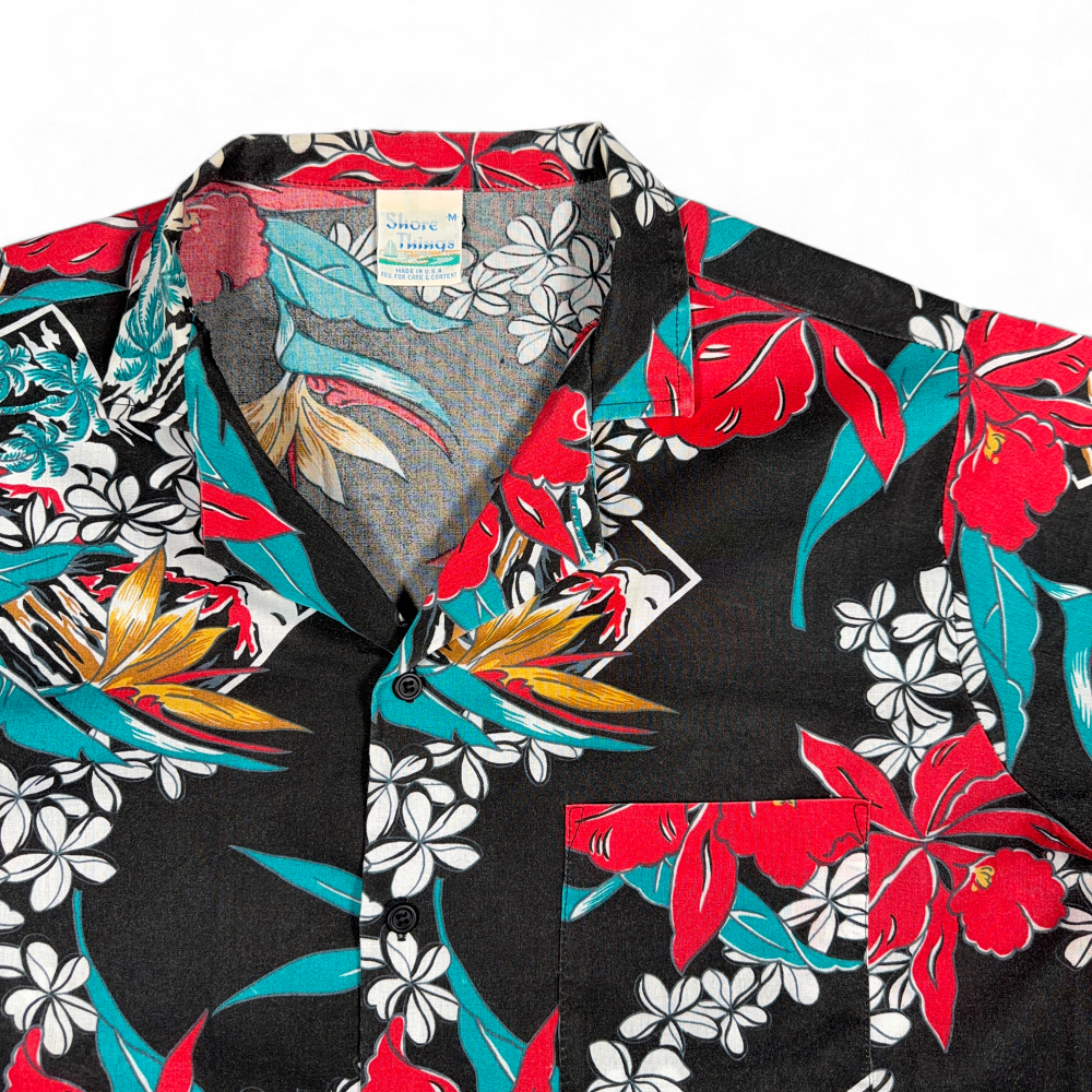 Vintage Shore Things Hawaiian Shirt Adult MEDIUM Black Floral Hibiscus USA 80s