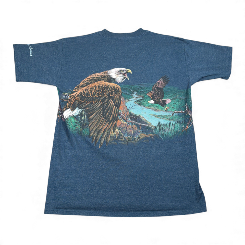 โ€ข Large double-sided graphic on front and back featuring two bald eagles soaring over a mountain river landscape