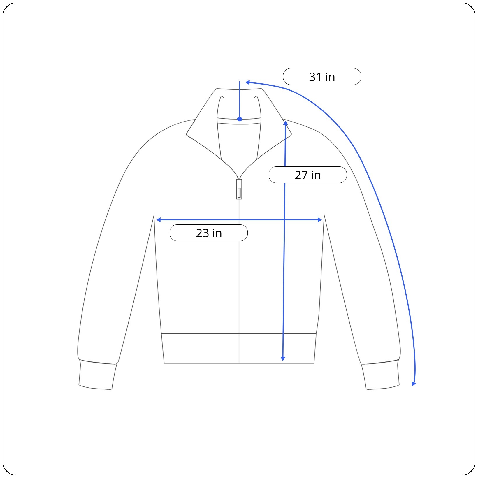 Sleeves: 31 inches (collar seam to cuff end)