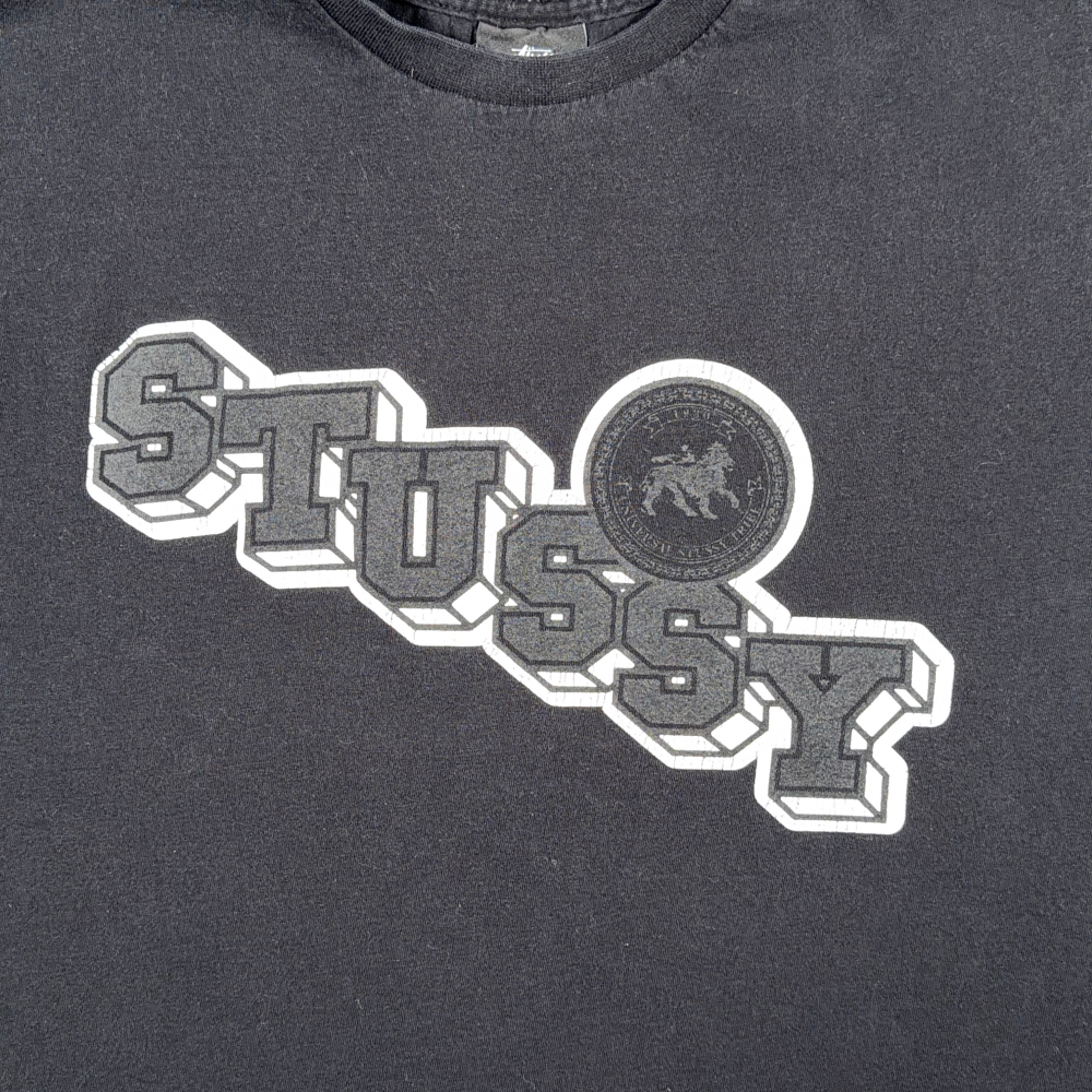 โข Large front graphic featuring “STUSSY” text and lion crest logo