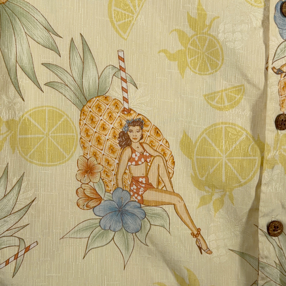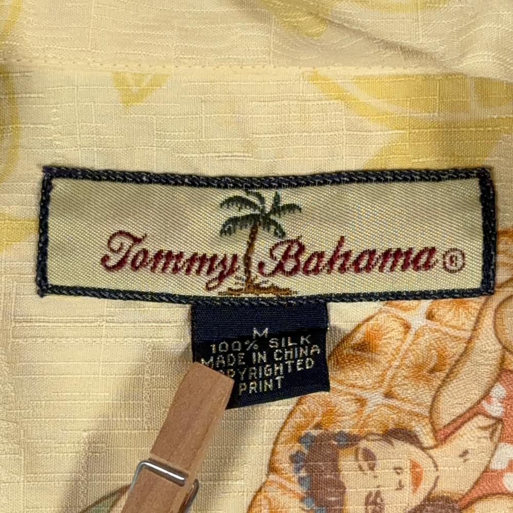 Vintage Tommy Bahama Hawaiian Shirt Adult MEDIUM Yellow Silk Pinup Girl Camp Y2K