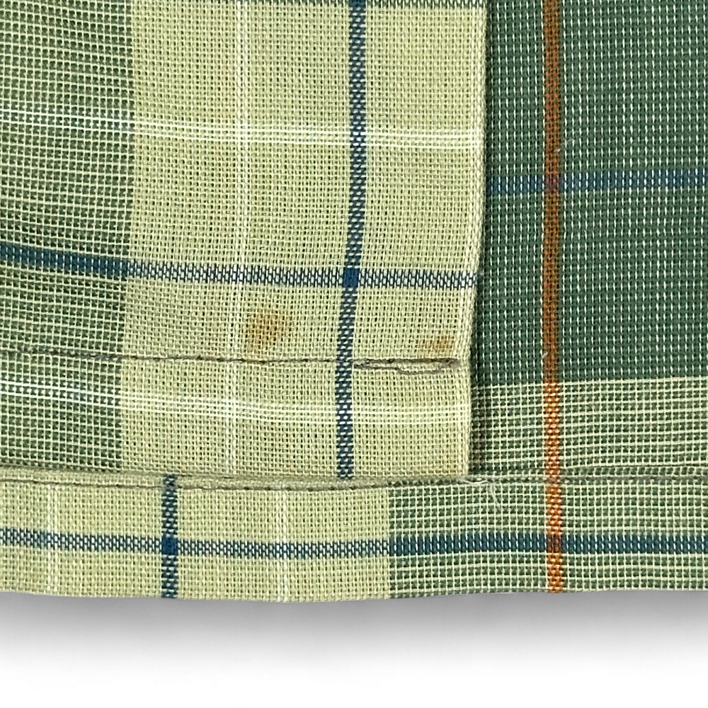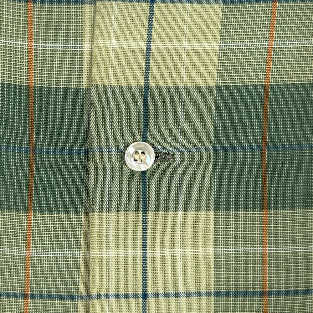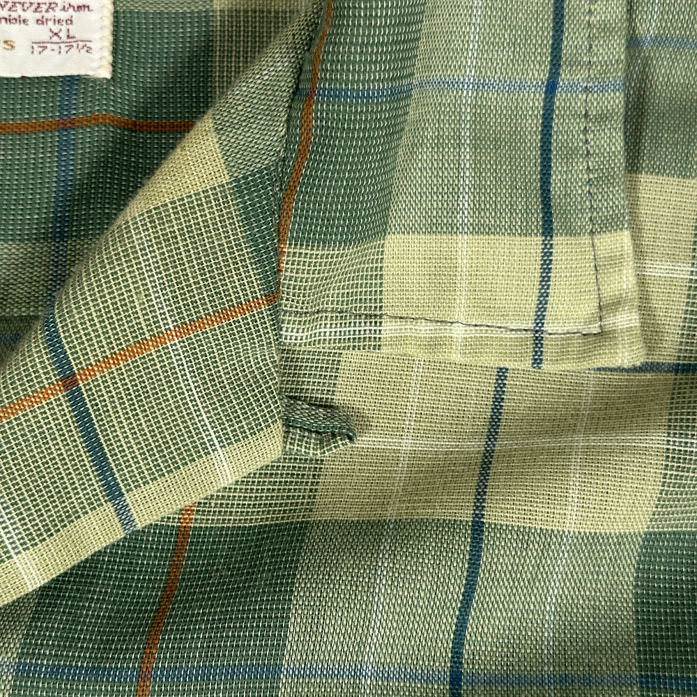 โข 60s vintage green, orange, blue, white plaid shirt. Material unknown, likely cotton poly blend