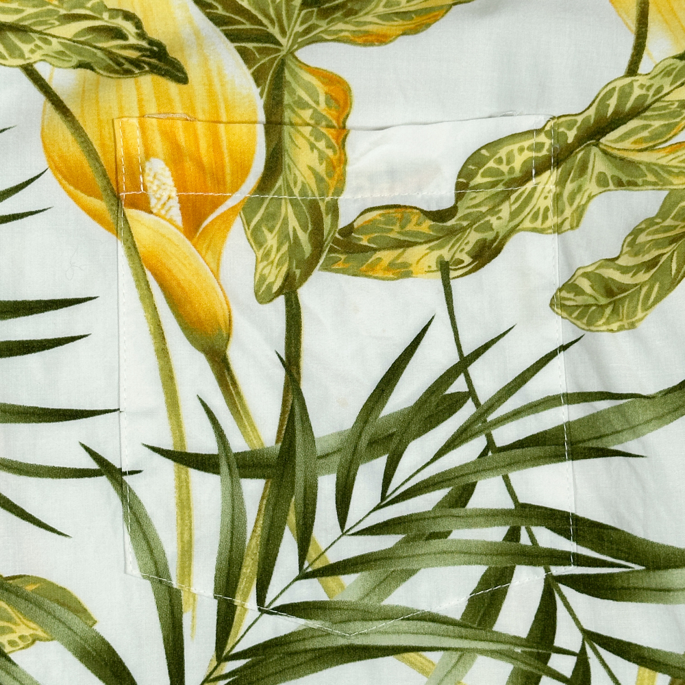 โ€ข Print features yellow Calla Lilies and palm fronds