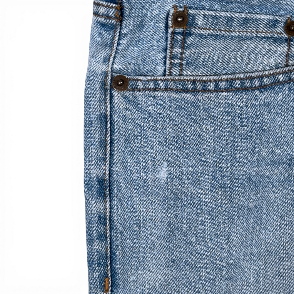 • Light wash denim with mild natural distressing