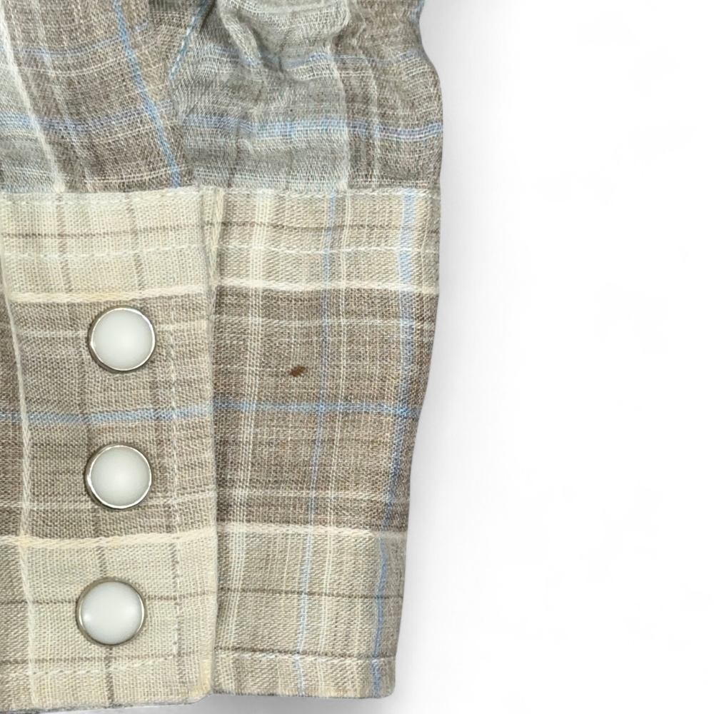 โข Brown, gray, and blue plaid cotton, polyester, and acrylic blend