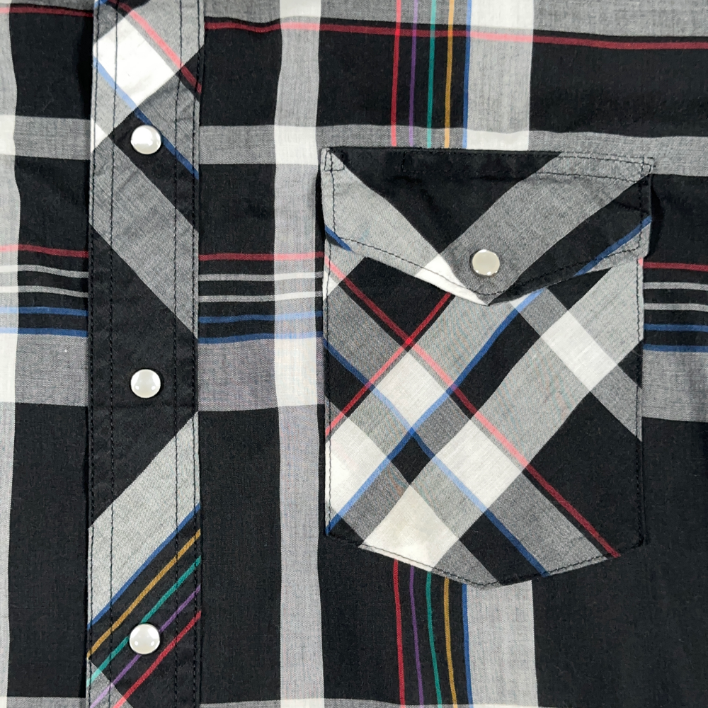 โข Black-and-white plaid 55% cotton and 45% polyester blend Western shirt with red, purple, green, and yellow highlight stripes